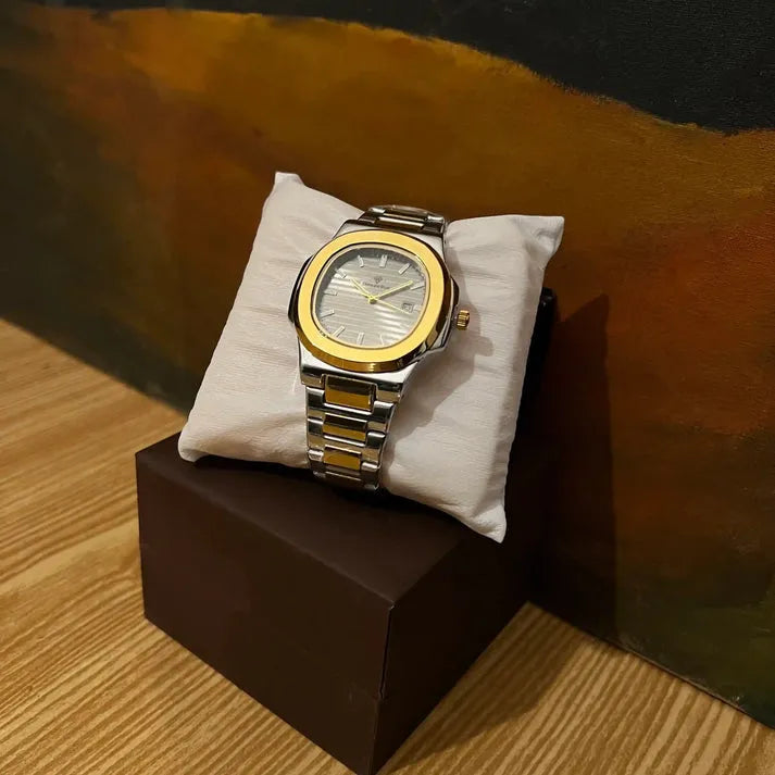 Add a touch of sophistication with this two-tone men’s watch, featuring a polished silver-gold case, classic blue dial with date window, and a durable stainless-steel bracelet strap. Perfect for formal and everyday wear.